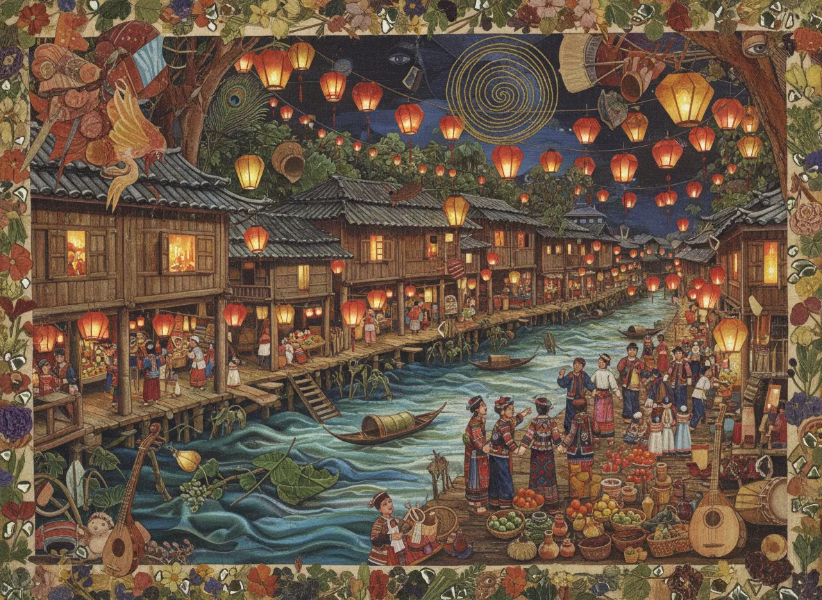 Riverside Dong minority village known for wooden stilt houses, traditional songs and lantern-lit night markets — cultural immersion and photography.